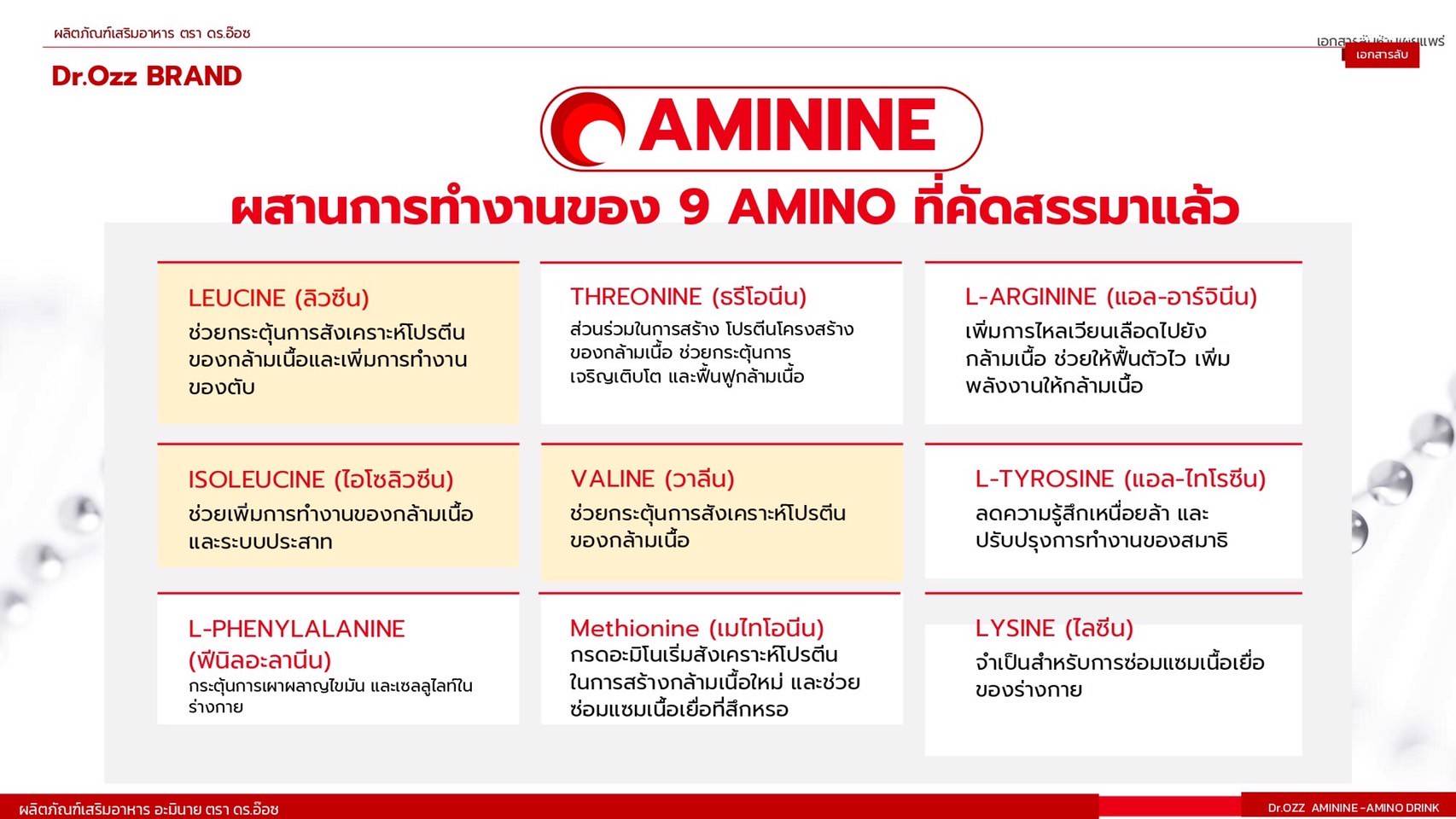AMININE (อมินาย) ผลิตภัณฑ์เสริมอาหารที่ผสานพลัง 9 กรดอะมิโนจำเป็น (9 Essential Amino Acids) ที่ร่างกายสร้างเองไม่ได้ คัดสรรมาเพื่อการบำรุงลึกระดับเซลล์ ช่วยฟื้นฟูร่างกาย เสริมสร้างกล้ามเนื้อ และชะลอความเสื่อมตามวัยอย่างมีประสิทธิภาพ
