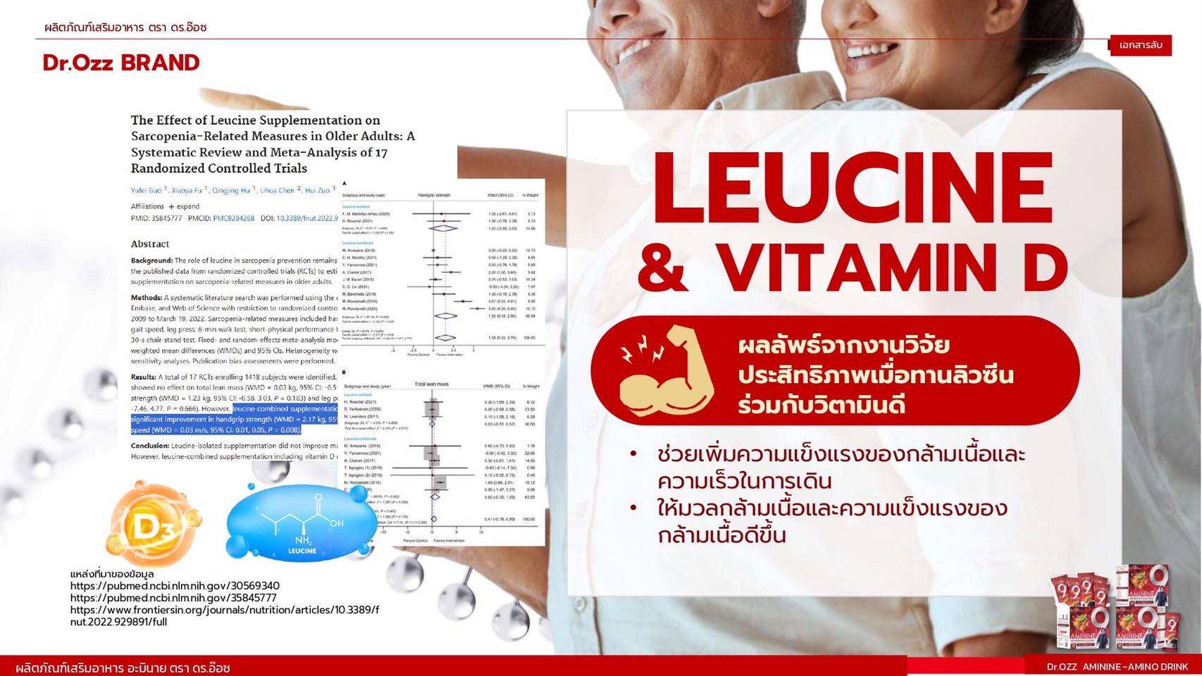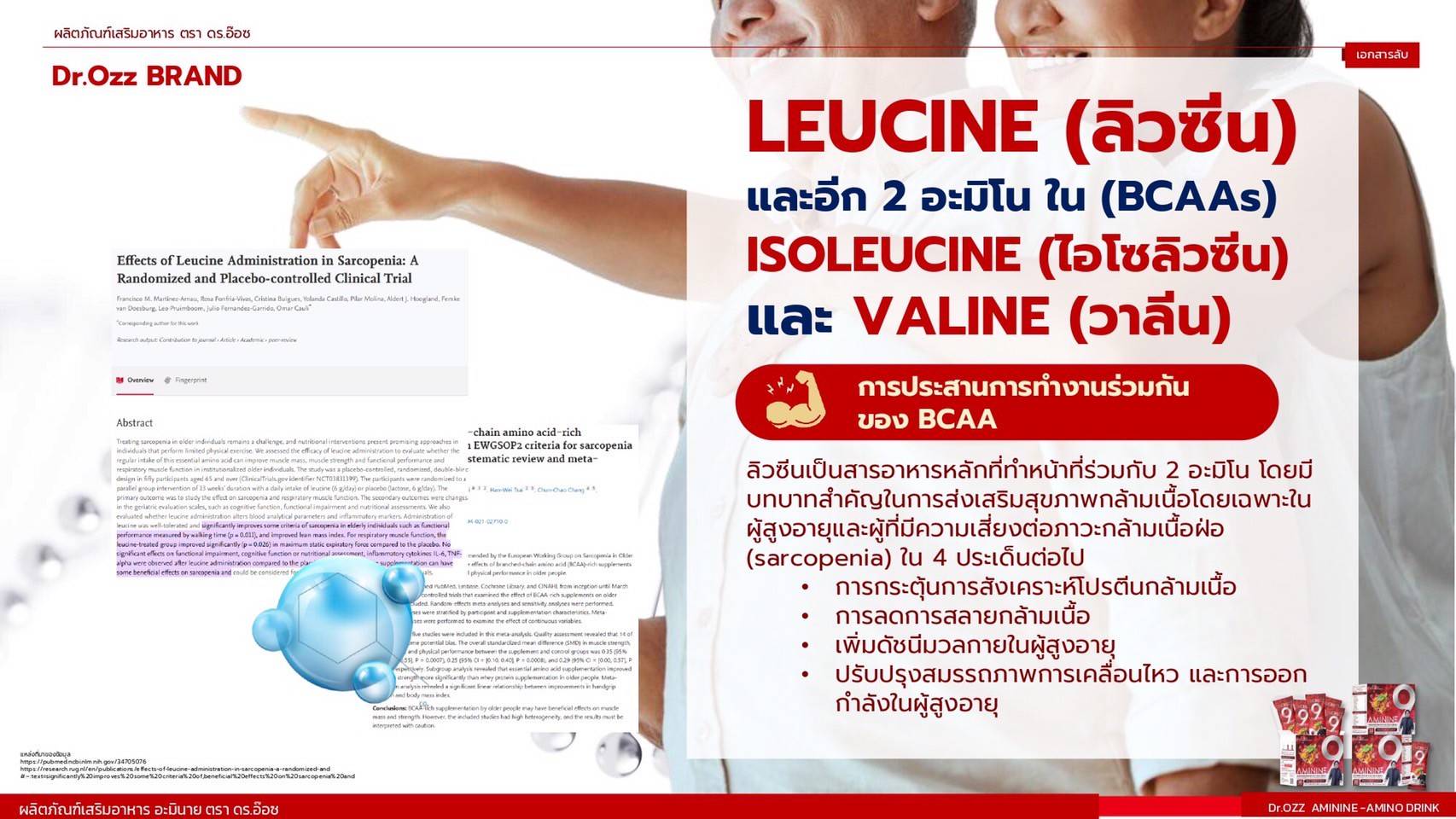 - LEUCINE (ลูซีน): หัวใจสำคัญของการกระตุ้นการสังเคราะห์โปรตีนในกล้ามเนื้อ และช่วยเพิ่มประสิทธิภาพการทำงานของตับ