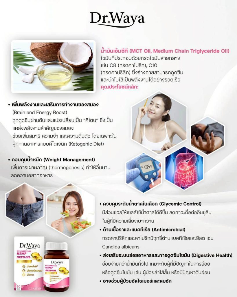 Dr.Waya Oil เป็นผลิตภัณฑ์เสริมสุขภาพที่ผสมผสานคุณประโยชน์จากน้ำมันงาดำ CBD และ MCT Oil เข้าด้วยกัน อุดมไปด้วยกรดไขมันดี วิตามิน และสารต้านอนุมูลอิสระ โดยเฉพาะเซซามิน (Sesamin) ซึ่งเป็นสารสำคัญที่พบในงาดำเท่านั้น ช่วยเสริมสร้างสุขภาพโดยรวมและปกป้องร่างกายจากอนุมูลอิสระ